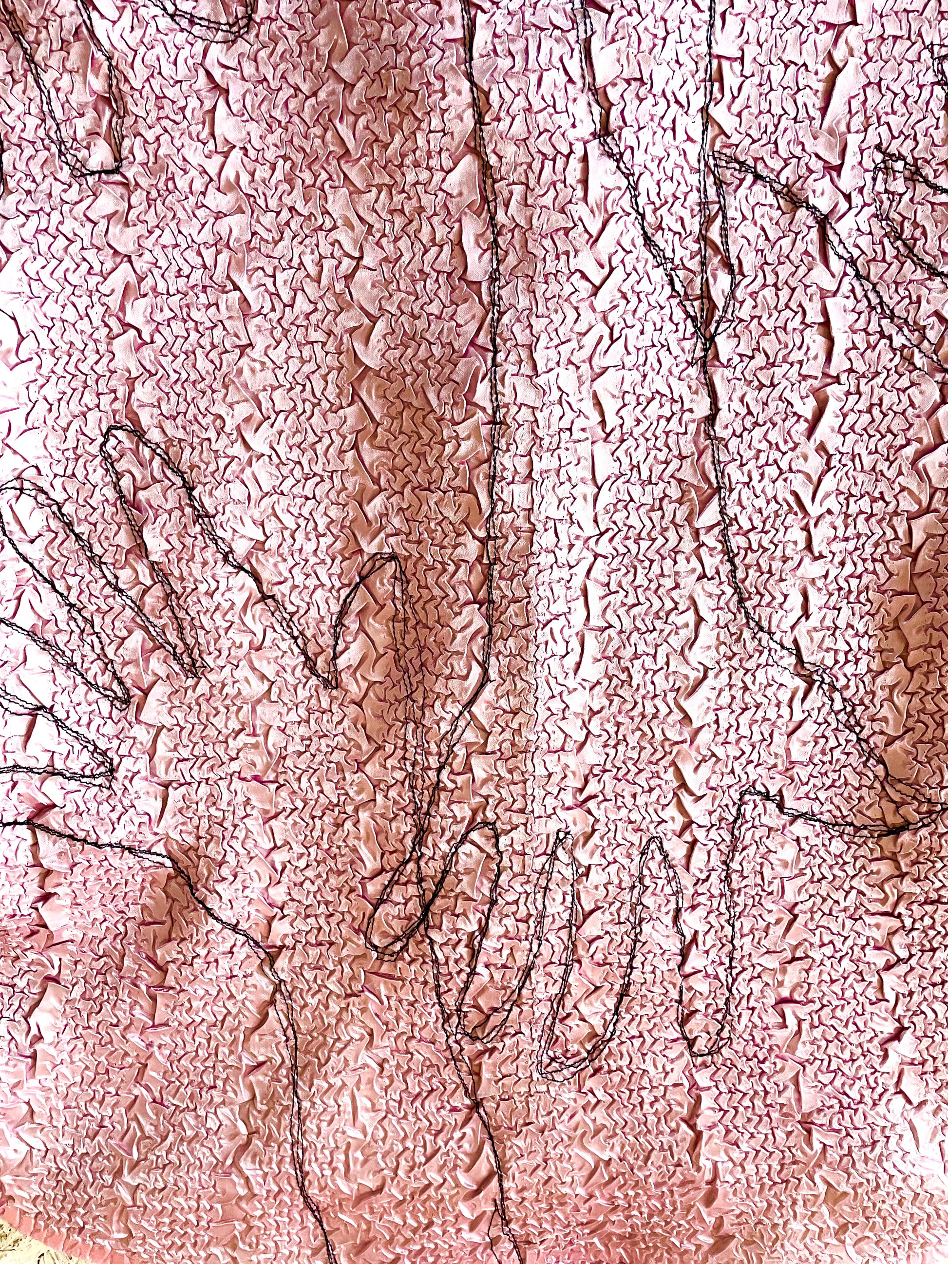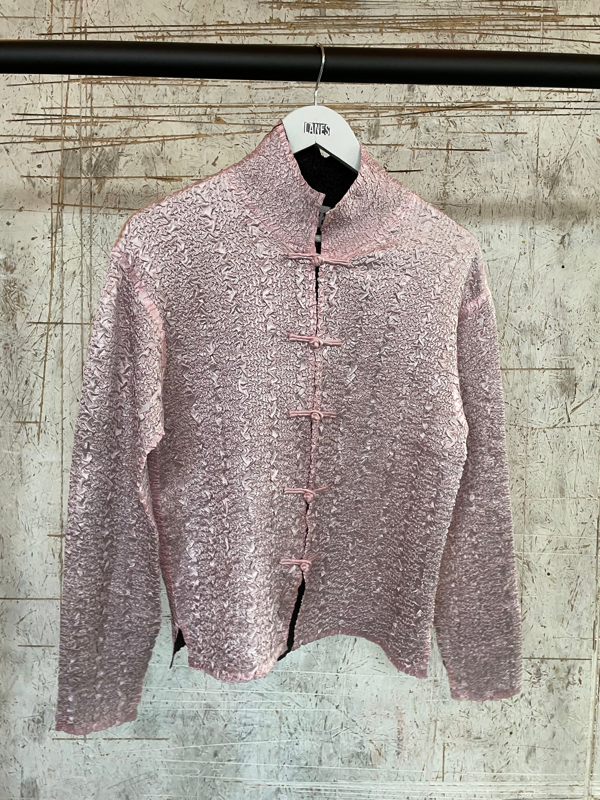 Japanese style light jacket in crinkle fabric, shiny pink colour, black inside with hand embroidery on back.
